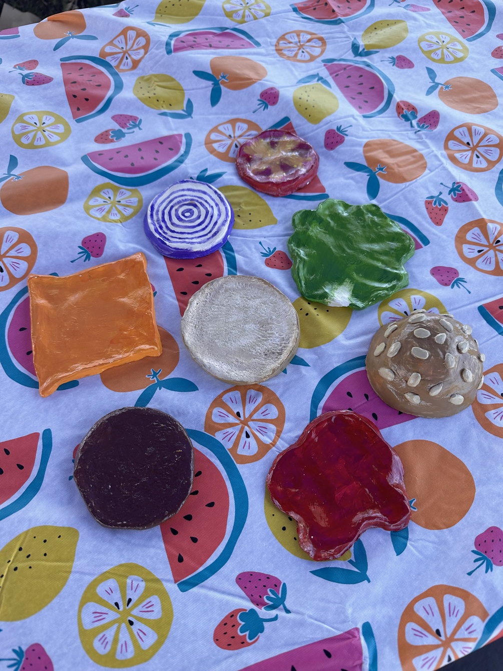 a build-your-own-burger coaster set hand sculpted and painted. Wipe clean gently,